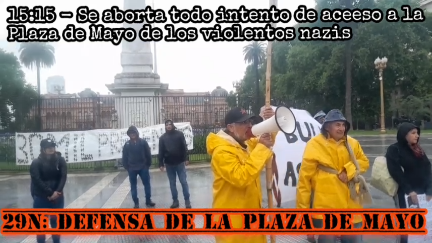 A las 15 horas, en la recova del Cabildo, un grupo de militantes de Derechos Humanos y de las organizaciones de izquierda Esperanza y Convergencia Socialista, avanzaron sobre la Plaza de Mayo tomando posición alrededor de la Pirámide de Mayo, en clara custodia de los pañuelos de las Madres de Plaza de Mayo.