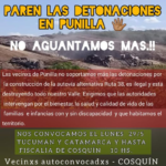 Hace un tiempo, el 23 de abril, un fallo judicial, abría una puerta de esperanza de comenzar a desandar algún camino de destrucción en el que está emperrado el Estado cordobés para construir sus malditas autovías que ya están destrozando el Valle de Punilla. Los vecinos ya cansados decidieron llevar a cabo este lunes 29 de mayo una denuncia colectiva contra las detonaciones y contra todo este atropello pseudoprogresista que está arrasando con la Madre Tierra y la riqueza natural del Valle de Punilla. Con tal motivo se convocan a la Fiscalía de Cosquín, sita en Tucumán y Catamarca de esa ciudad mediterránea.
