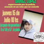 A Jorge Daniel lopez lo acusan de un robo que ocurrió en La Plata, mientras el se estaba levantando para ir al médico en lanus este. A las 8 tenía turno porque había tenido un accidente en su mano y hacia kinesiología. Toma el colectivo y concurre a la clínica, asi lo determina el registro de sube y la planilla que firma el médico en cada sesión. Posteriormente le hace un allanamiento la DDI de la plata . En un momento Jorge ve que un policía va hasta el coche y se pone algo en el bolsillo.cuando protesta lo obligan a callarse. Al rato le plantan dos o tres chucherías de ínfimo valor ( de un robo donde habían dólares y alhajas de oro) y ahí está detenido, alejado de su familia que vive carencias porque es el el único sostén económico.desde que vino a Buenos Aires desde jujuy, no hizo mas que trabajar. Hacia 5 años que se desempeñaba como gomero en un taller mecánico. Hoy esta a la espera de una resolución.