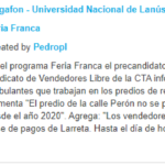 En el programa Feria Franca el precandidato a legislador porteño Omar Guaraz, titular del Sindicato de Vendedores Libres de la CTA informa sobre la situación de los vendedores ambulantes que trabajan en los predios de reubicación que había alquilado el gobierno porteño. Comenta “El predio de la calle Perón no se paga desde el año 2018, (…) el de la calle la Rioja desde el año 2020”. Agrega: “Los vendedores se encuentran ante un inminente desalojo por el cese de pagos de Larreta. Hasta el día de hoy el gobierno porteño no da respuesta”