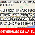 Con el escrutinio cerrado a las 02:45 del día de hoy y con las 1416 mesas escrutadas, estamos en condiciones de afirmar que Juntos por el Cambio se impuso, con su fórmula Ignacio Torres – Gustavo Menna, con 116.432 votos (el 35.71%) en la elección de Gobernador de la Provincia de Chubut. A pesar de la feroz interna en la que se encuentra esa agrupación, aprovecharon a mostrar la victoria en Chubut como una estampa de unidad para el resto de los distritos. Igualmente, la cosa no salió tan bien, ya que entre los individualistas militantes del PRO hay bronca que no se puede ocultar. La diferencia fue exigua con sus competidores, pero les brindo lo que buscaban: vencer a los peronistas en la Provincia después de 20 años y lo lograron.