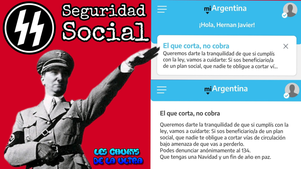 Ya en el colmo, de lo que estos Chukys pueden hacer en su fascismo, en la App “Mi Argentina” donde el Estado controla que cumplas con todos sus latrocinios fielmente y que este Gobierno no desprecia como medio de control social, apareció esta advertencia para que delates gente y así como se les dé la gana iniciar sus persecuciones a todes les opositores y comenzar a recortar donde la gente más necesita y ponerlos bajo su red clientelar que en sus intenciones te hará reír del caudillaje feudal peronista, pretenden ser más fachos y dominadores que nadie y los que se dicen “anarcocapitalistas” están mostrando que dependen de la represión y la caja estatal más que nadie para servir al ajuste con la dosis de fuerza bruta que no le van a escatimar nunca.