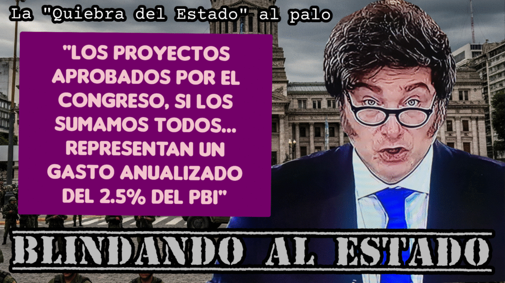 - “Los proyectos aprobados por el Congreso, si los sumamos todos… representan un gasto anualizado de un 2.5% del PBI”: En si teoría ultra paranoica asegura que “reinstalar la moratoria previsional, aumentar el salario docente y las por prescripciones discapacidad” atentan contra el gasto público ya que generan una deuda de 300000 millones de dólares. De nuevo la existencia de la discapacidad, los jubilados y los maestros es algo que el Estado considera un gasto y suponemos que no faltará mucho para que Milei eliminar ese “lastre” de “su” economía.
