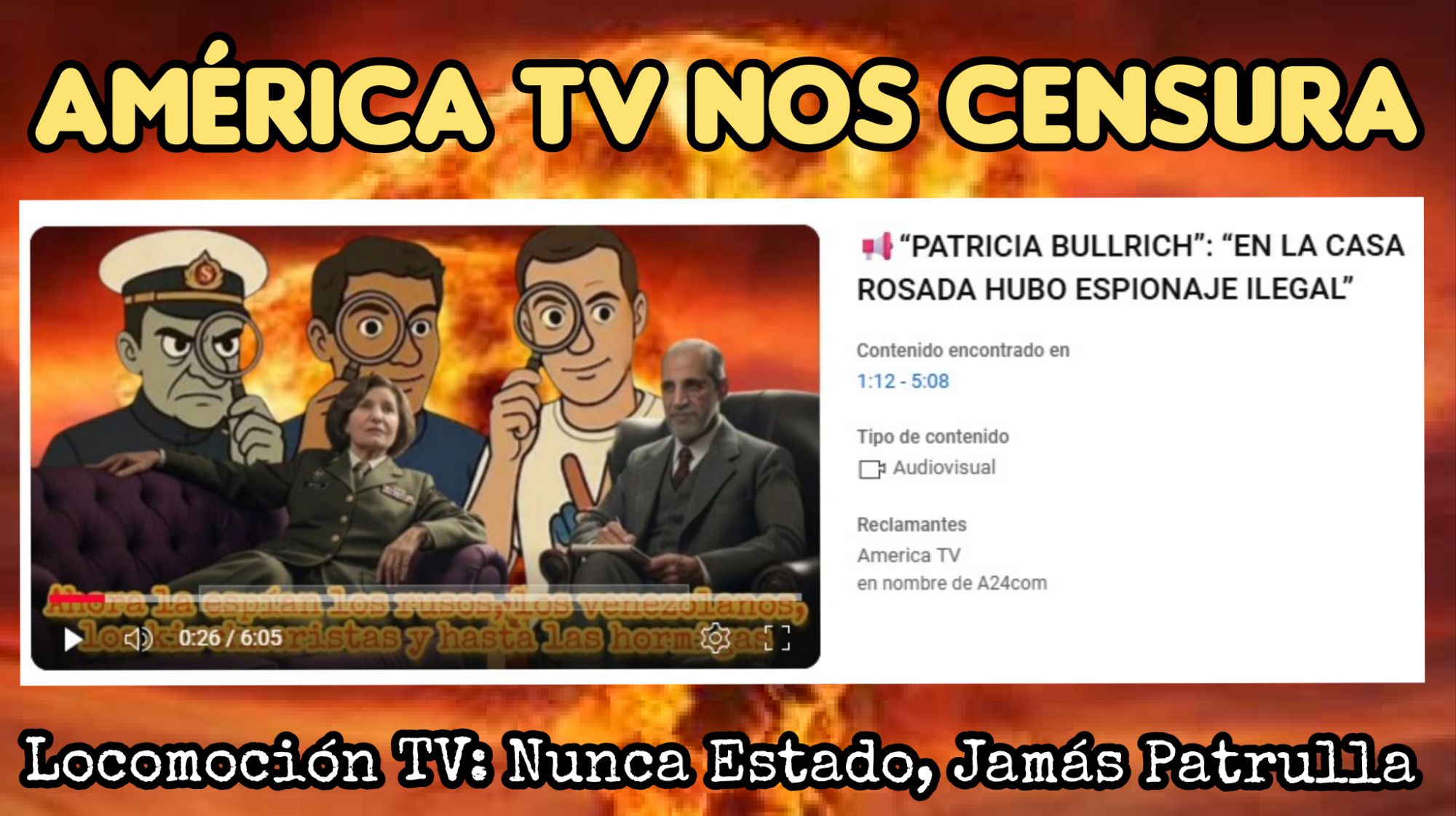 Dicen que el reclamo no afecta al video ni es un reclamo de Derechos de Autor. Aparte de ser inentendible el planteo es increíble que los periodistas veden el acceso a esa entrevista de un funcionario de Estado, no una empleada de América TV, por la cual quieren censurarte pero que no se note. No les importan los derechos de autor, les importa vedar el acceso a la información y detentar el poder de censurar contenidos en otros que no les parecen ser convenientes a sus intereses, que poco nos importan ya que a diferencia de ellos podemos decir: ¡NUNCA ESTADO, JAMÁS PATRULLA!