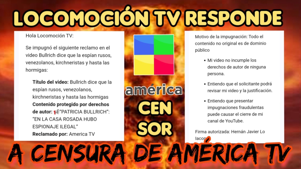 Seguiremos y procedimos a ejecutar la vía burocrática interna de Youtube que da menos garantías que las de preso de Guantánamo. Generalmente, terminan dejando caer los reclamos, pero los más atrevidos y suponemos que este es el caso, insisten en la censura. En caso de que hagan la estupidez de insistir, recortaremos el segmento del informe, y pondremos un mensaje tamaño baño que diga “INFORME CON RECORTES POR CENSURA DE AMÉRICA TV”.