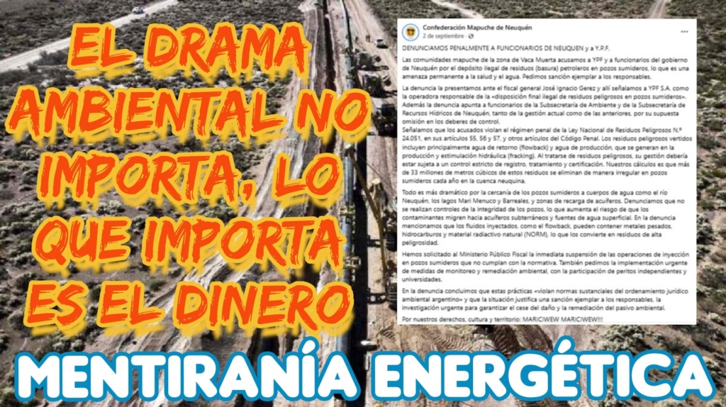 EL 3 de septiembre La Confederación Mapuche de Neuquén acusó a la empresa YPF y a funcionarios del Estado por el depósito ilegal de residuos petroleros de Vaca Muerta en pozos sumideros.