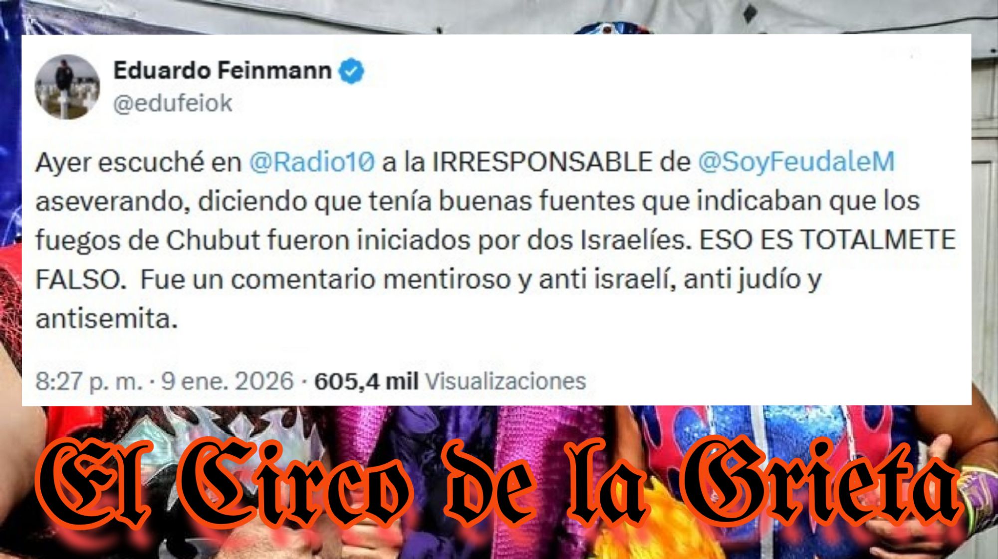 “Ayer escuché en Radio 10 a la irresponsable de @soyfeudalemm aseverando, diciendo que tenía buenas fuentes que indicaban que los fuegos de Chubut fueron iniciados por dos israelíes. Eso es totalmente falso. Fue un comentario mentiroso, antiisraelí, antijudío y antisemita”.