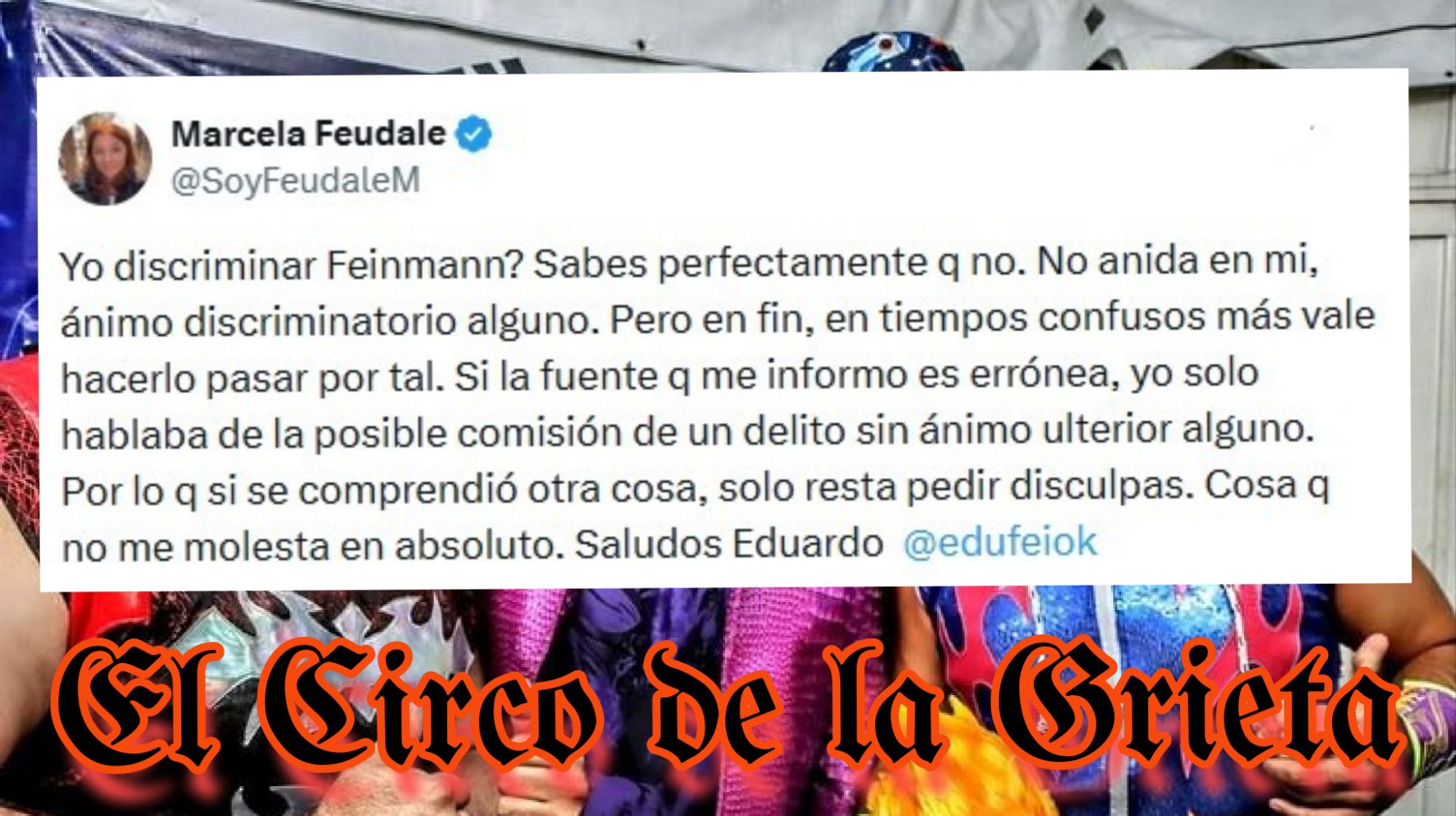 “Yo discriminar Feinmann? Sabes perfectamente q no. No anida en mi, ánimo discriminatorio alguno. Pero en fin, en tiempos confusos más vale hacerlo pasar por tal. Si la fuente q me informo es errónea, yo solo hablaba de la posible comisión de un delito sin ánimo ulterior alguno. Por lo q si se comprendió otra cosa, solo resta pedir disculpas. Cosa q no me molesta en absoluto. Saludos Eduardo @edufeiok“.