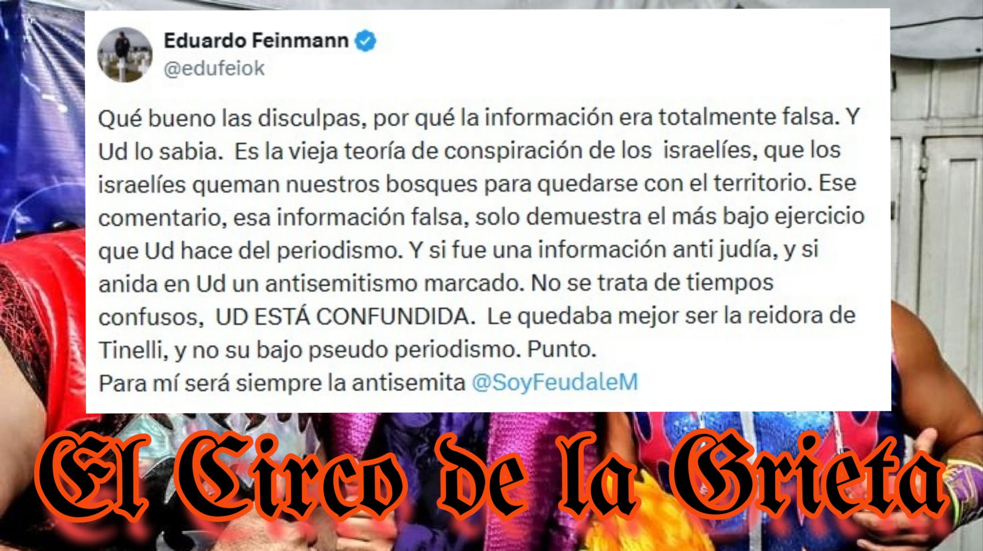 “Qué bueno las disculpas, por qué la información era totalmente falsa. Y Ud lo sabia. Es la vieja teoría de conspiración de los israelíes, que los israelíes queman nuestros bosques para quedarse con el territorio. Ese comentario, esa información falsa, solo demuestra el más bajo ejercicio que Ud hace del periodismo. Y si fue una información anti judía, y si anida en Ud un antisemitismo marcado. No se trata de tiempos confusos, UD ESTÁ CONFUNDIDA. Le quedaba mejor ser la reidora de Tinelli, y no su bajo pseudo periodismo. Punto. Para mí será siempre la antisemita @SoyFeudaleM“.