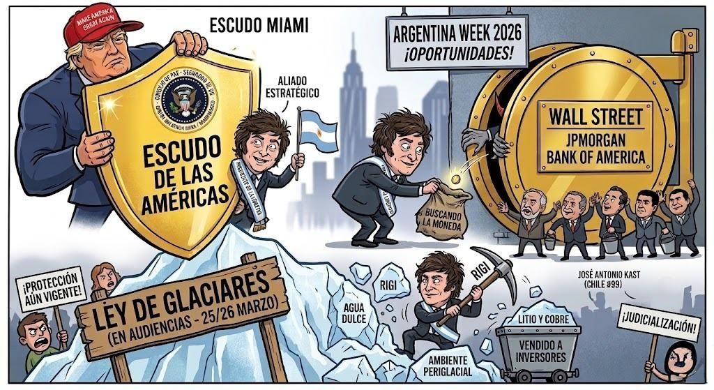Desde los salones dorados del Doral, donde aceptó con risas que el patrón no piensa aprender su “maldito idioma” y se ofreció como escudo con otros genuflexos de la región, hasta el asfalto frío de Nueva York, Milei ha ido a ofrecer lo que no es suyo: nuestros glaciares, nuestro litio y nuestro futuro, todo a cambio de una “moneda” que Wall Street retacea mientras cuenta sus barriles de petróleo.