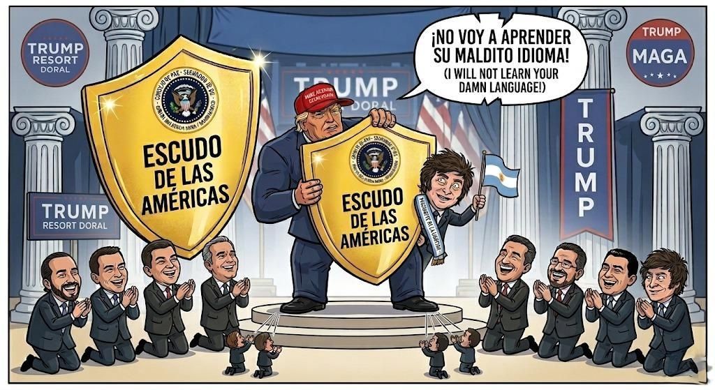 - Cumbre “Escudos de las Américas”: Milei participó como figura central en este foro convocado por Donald Trump. El evento funcionó como una plataforma para consolidar a Argentina como el “escudo” político y estratégico de los intereses estadounidenses en la región, junto a otros mandatarios genuflexos como Nayib Bukele (El Salvador), Daniel Noboa (Ecuador), Santiago Peña (Paraguay) y Luis Abinader (República Dominicana).