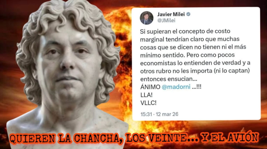 Mientras Milei teoriza sobre costos marginales y ningunea al que cuestiona el gasto, la realidad les estalla en la cara. Quieren la chancha, los veinte y la máquina de hacer chorizos: el discurso de la austeridad para el jubilado, y el privilegio del remise de lujo para la familia del vocero. Es el desprecio absoluto por el que paga la fiesta.
