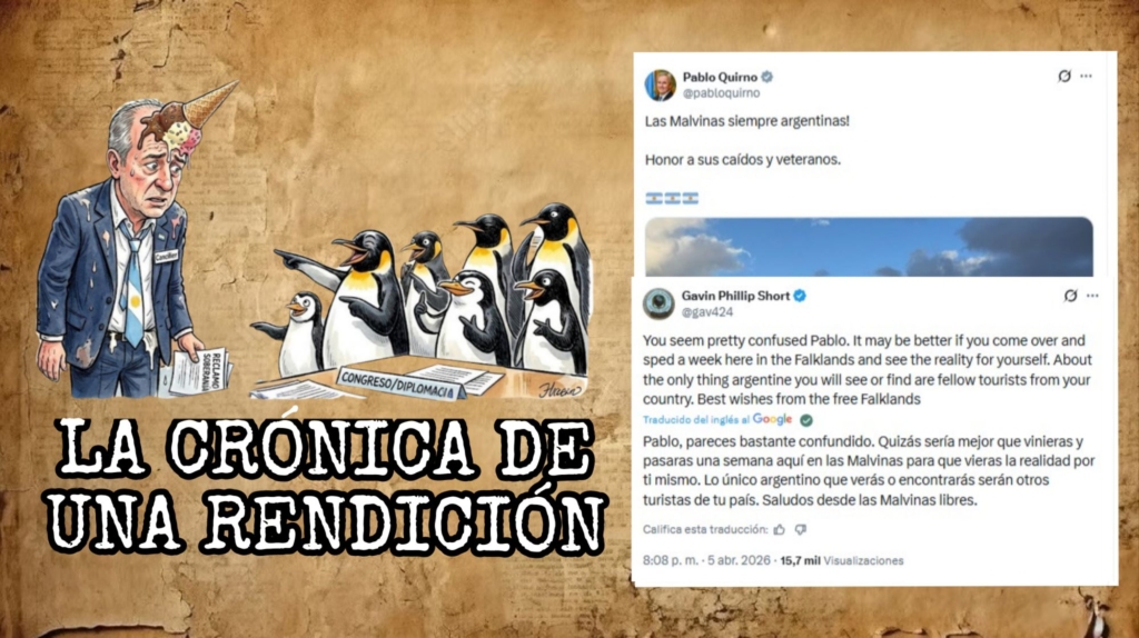- Es el Canciller transformado en un aspirante a turista, regalándole al Reino Unido el argumento que vienen buscando hace décadas: “Miren, hasta el propio Canciller argentino reconoce que tiene que negociar con los isleños para poder entrar”.